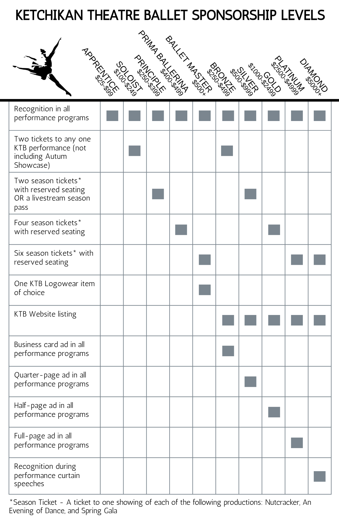 Founded in 1961, Ketchikan Theatre Ballet (KTB) strives to provide the highest quality of dance education to Ketchikan’s youth, and proudly presents the community with four performances each year. We at KTB not only teach dance, but also help our dancers develop discipline, organizational skills, and a positive self-image. KTB Patrons are an integral part of ensuring a continuously successful dance program year after year.
